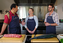The Kai Safari makes its way to Akaroa, an area that was considered New Zealand’s only French settlement. Pio visits one of the local salmon farms within the harbor and gets a few tips on how to reel in a without a fishing rod. The local butcher Brendan Foster gets in on the action adding meat to the menu while Gilda Otway adds her share by supplying this season’s hazelnuts. A fine dining experience with the help of the Akaroa Cooking School wraps up our French Connection experience.