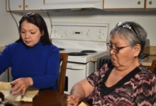 Elder Leesee Mary Kakee teaches Teena Kakee the names of animal parts, specifically fish head bones, during a visit to the community of Pangnirtung.