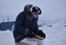 Geeold Kakkik of Pangnirtung shows us how he fashions one of his many hunting tools, including a seal hunting screen called “taluaq.” The screen has many features that all serve one important purpose: to camouflage against the snow while hunting.