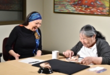 Iqaluit Elder Alice Joamie teaches Teena Kakee the names of seal flipper bones along with an old game she played with her siblings that consisted of seal flipper bones and a hand-sewn seal skin sack.